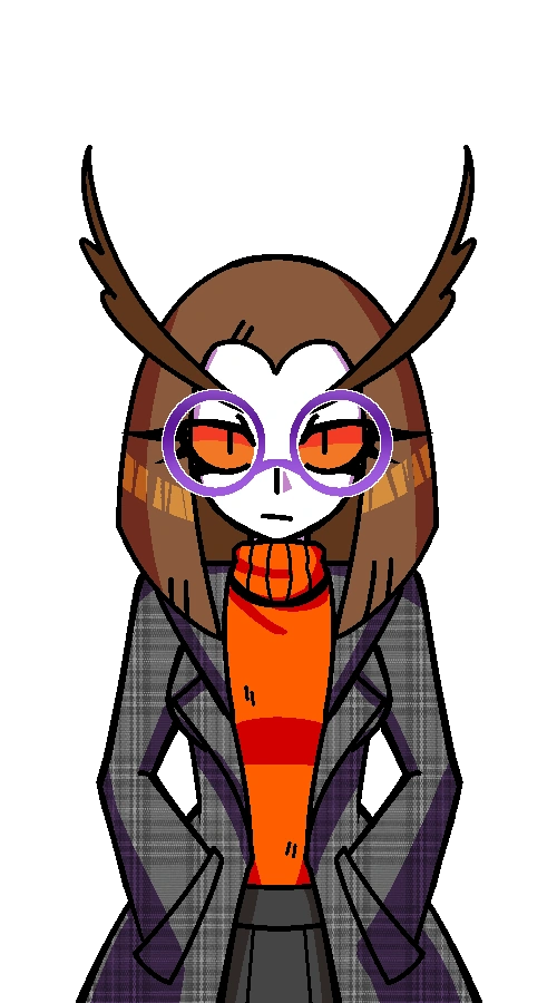 Twyla is a short young woman, described by Mary as being a “small girl” like her. She has straight brown hair, that is shaped in a way that resembles the face of an owl. Her eyes have an orange sclera and she has small brown pupils, with purple framed circle glasses on top. She has long eyebrows, described as being spectacular and resembling an owl.